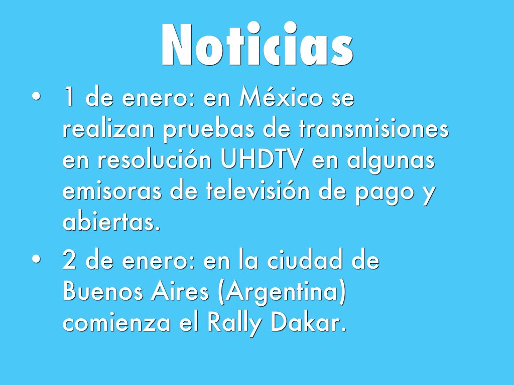 • 2 de enero: en la ciudad de Buenos Aires (Argentina) comienza el Rally Dakar.