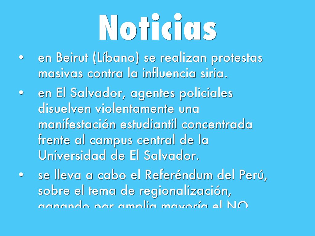 • se lleva a cabo el Referéndum del Perú, sobre el tema de regionalización, ganando por amplia mayoría el NO.