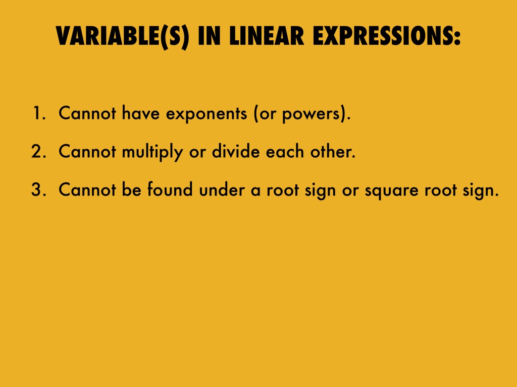 - No variable in a linear equation is raised to a power greater than 1 or used as the denominator of a fraction.