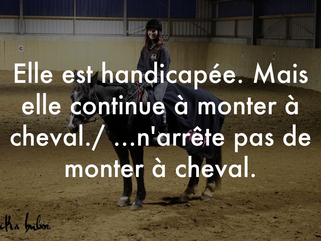 Elle est handicapée. Mais elle continue à monter à cheval./ ...n'arrête pas de monter à cheval.