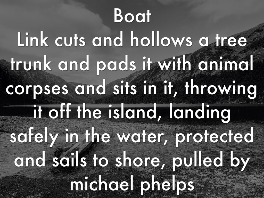 Link cuts and hollows a tree trunk and pads it with animal corpses and sits in it, throwing it off the island, landing safely in the water, protected and sails to shore, pulled by michael phelps