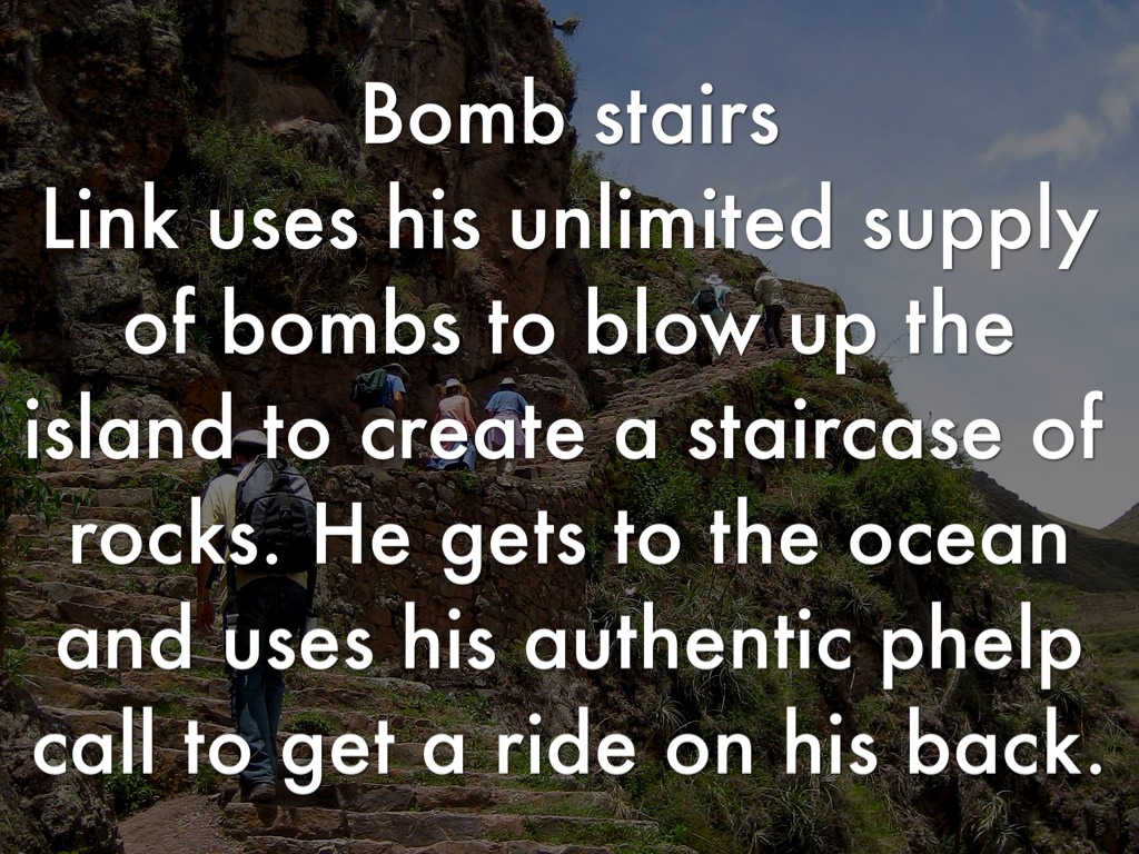 Link uses his unlimited supply of bombs to blow up the island to create a staircase of rocks. He gets to the ocean and uses his authentic phelp call to get a ride on his back.