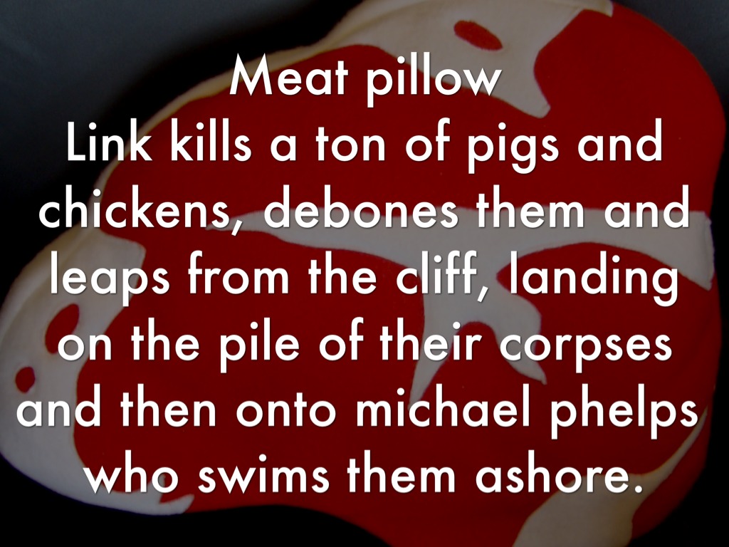Link kills a ton of pigs and chickens, debones them and leaps from the cliff, landing on the pile of their corpses and then onto michael phelps who swims them ashore.
