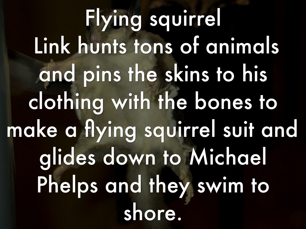 Link hunts tons of animals and pins the skins to his clothing with the bones to make a flying squirrel suit and glides down to Michael Phelps and they swim to shore.