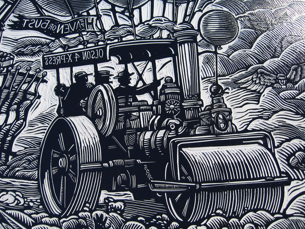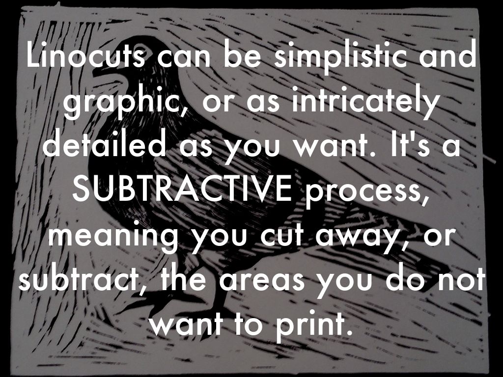 Linocuts can be simplistic and graphic, or as intricately detailed as you want. It's a SUBTRACTIVE process, meaning you cut away, or subtract, the areas you do not want to print.