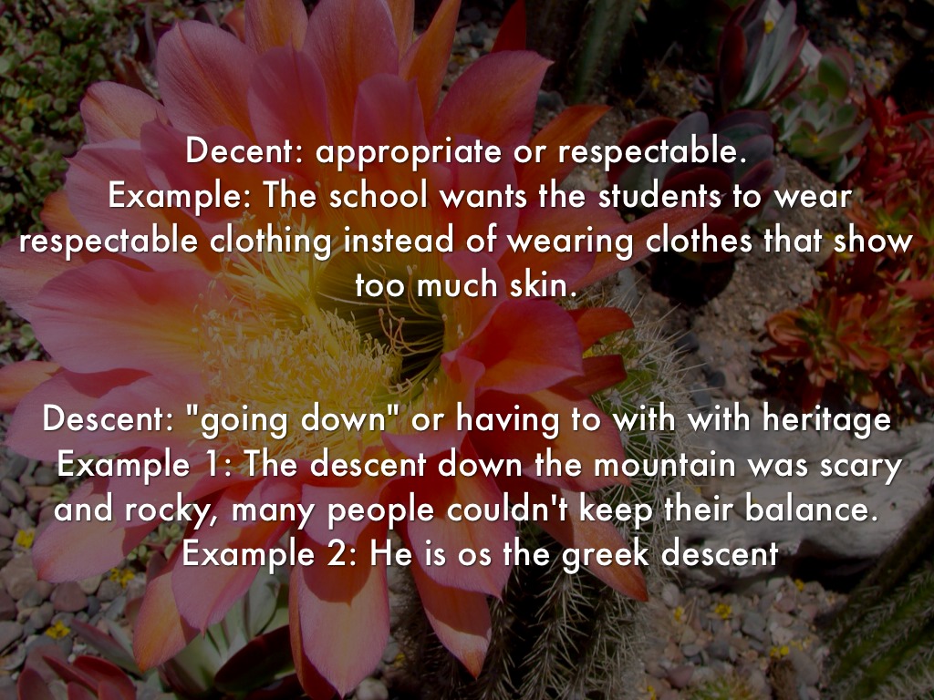 Descent: "going down" or having to with with heritage Example 1: The descent down the mountain was scary and rocky, many people couldn't keep their balance. Example 2: He is os the greek descent