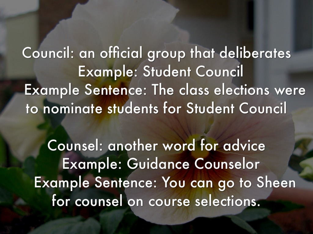Counsel: another word for advice Example: Guidance Counselor Example Sentence: You can go to Sheen for counsel on course selections.
