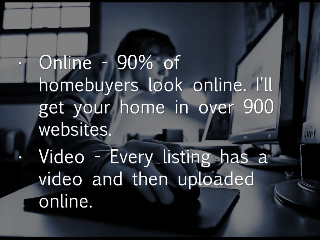 Online - 90% of homebuyers look online. I'll get your home in over 900 websites.