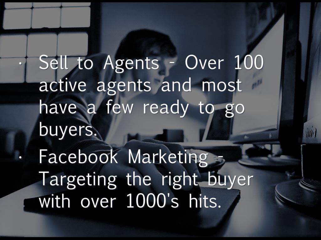 Sell to Agents - Over 100 active agents and most have a few ready to go buyers.
