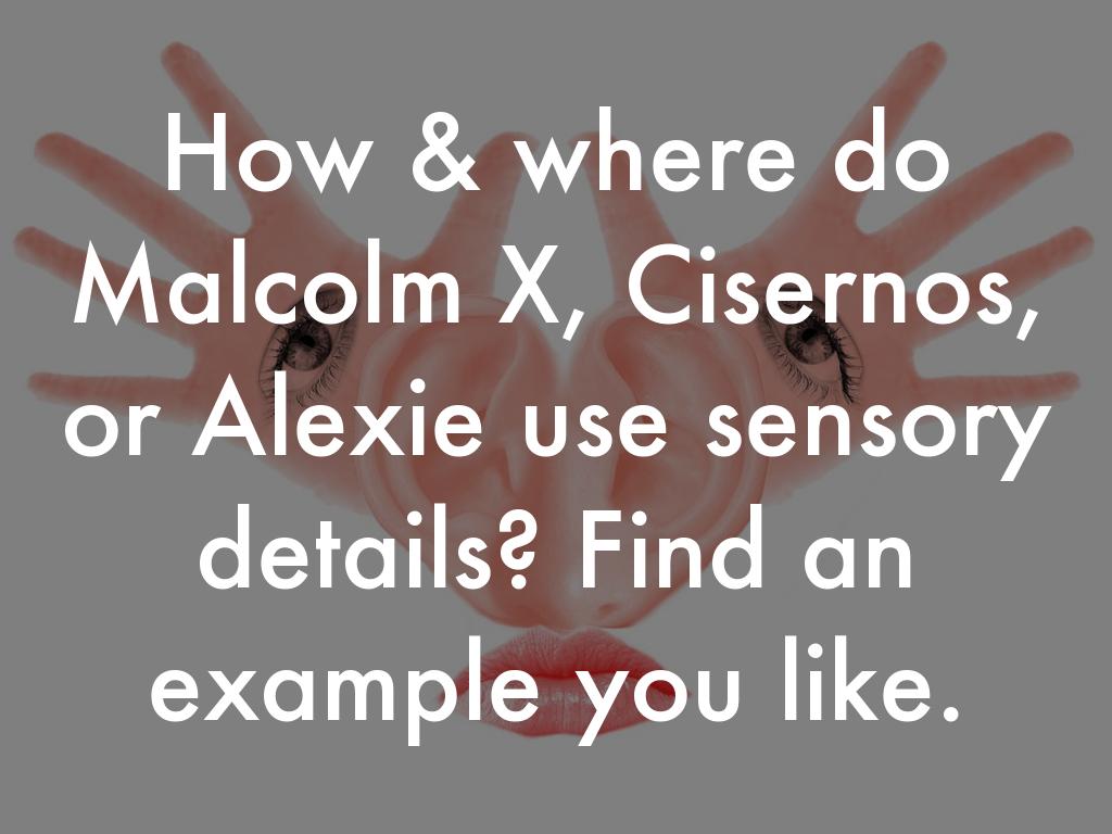 How & where do Malcolm X, Cisernos, or Alexie use sensory details? Find an example you like.