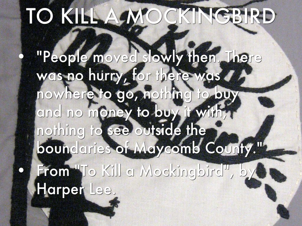 "People moved slowly then. There was no hurry, for there was nowhere to go, nothing to buy and no money to buy it with, nothing to see outside the boundaries of Maycomb County."