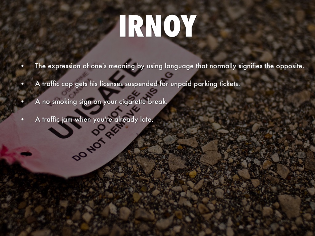 • The expression of one's meaning by using language that normally signifies the opposite.