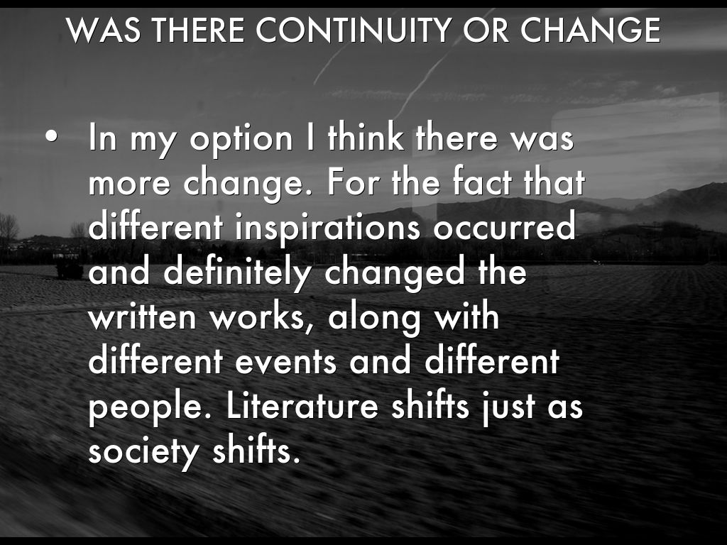 In my option I think there was more change. For the fact that different inspirations occurred and definitely changed the written works, along with different events and different people. Literature shifts just as society shifts.