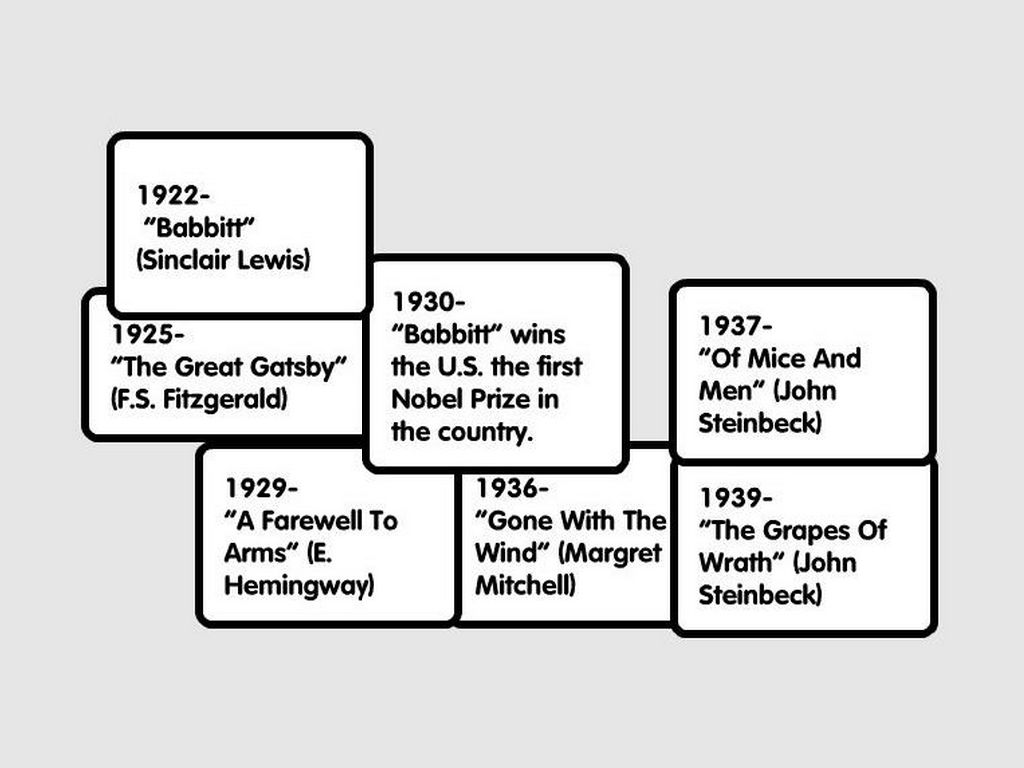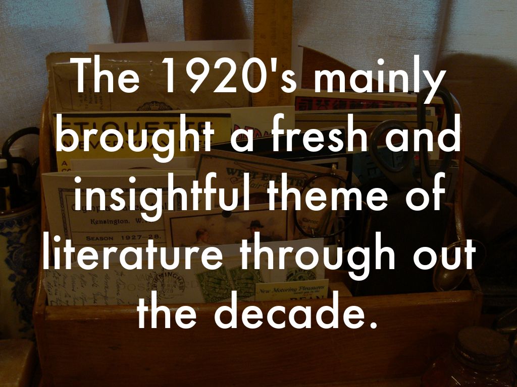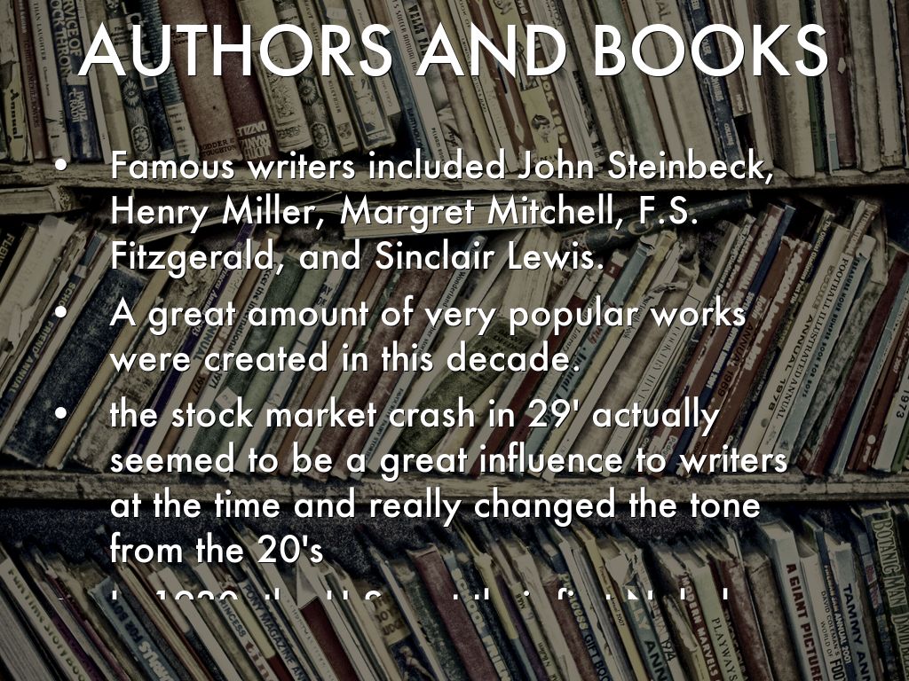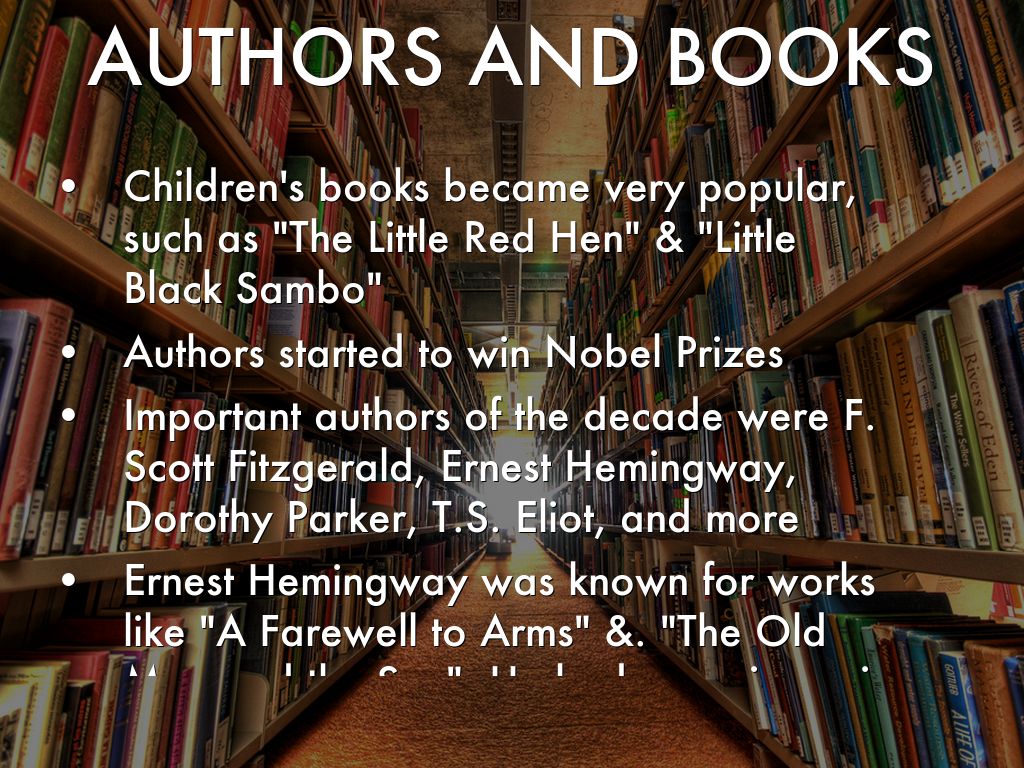 Important authors of the decade were F. Scott Fitzgerald, Ernest Hemingway, Dorothy Parker, T.S. Eliot, and more
