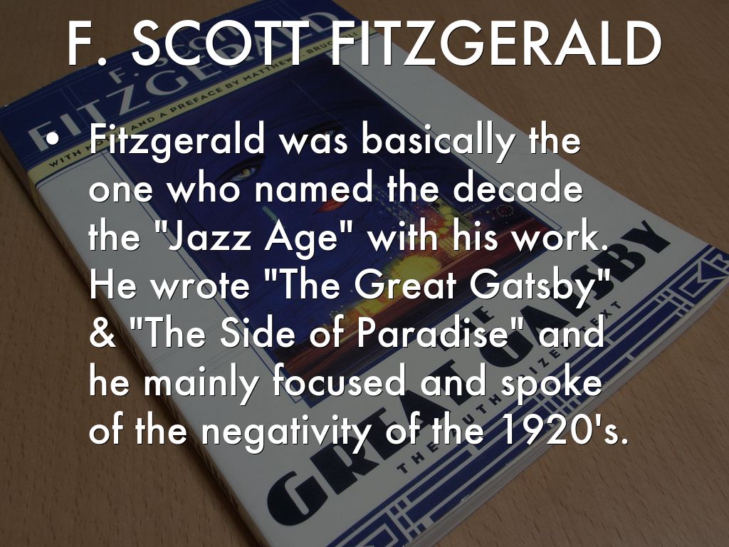Fitzgerald was basically the one who named the decade the "Jazz Age" with his work. He wrote "The Great Gatsby" & "The Side of Paradise" and he mainly focused and spoke of the negativity of the 1920's.