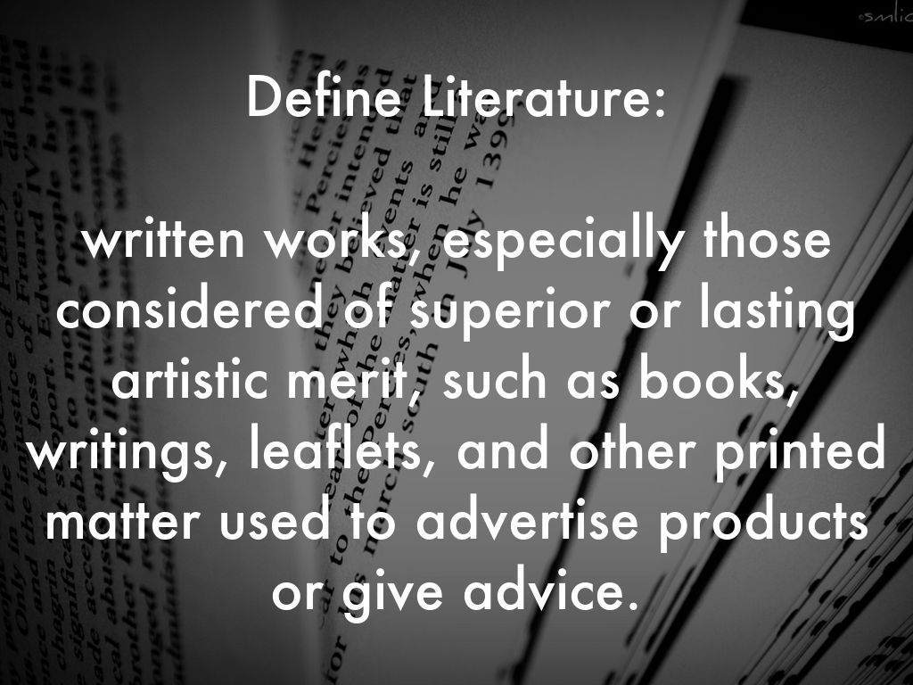 written works, especially those considered of superior or lasting artistic merit, such as books, writings, leaflets, and other printed matter used to advertise products or give advice.