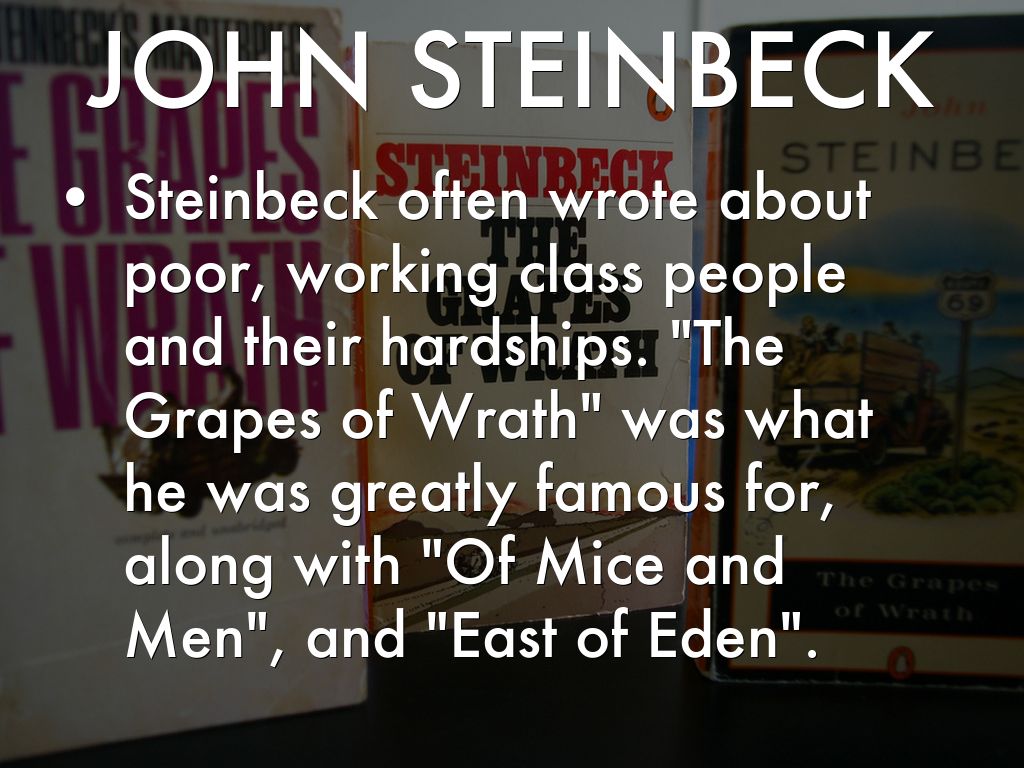 Steinbeck often wrote about poor, working class people and their hardships. "The Grapes of Wrath" was what he was greatly famous for, along with "Of Mice and Men", and "East of Eden".