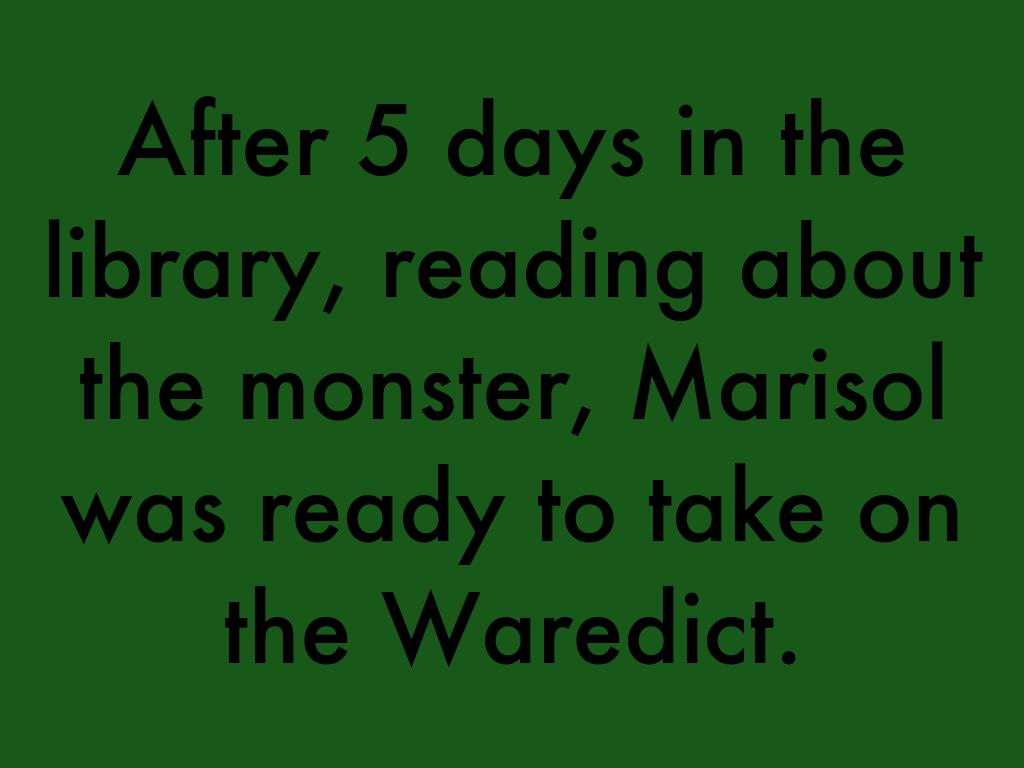 After 5 days in the library, reading about the monster, Marisol was ready to take on the Waredict.