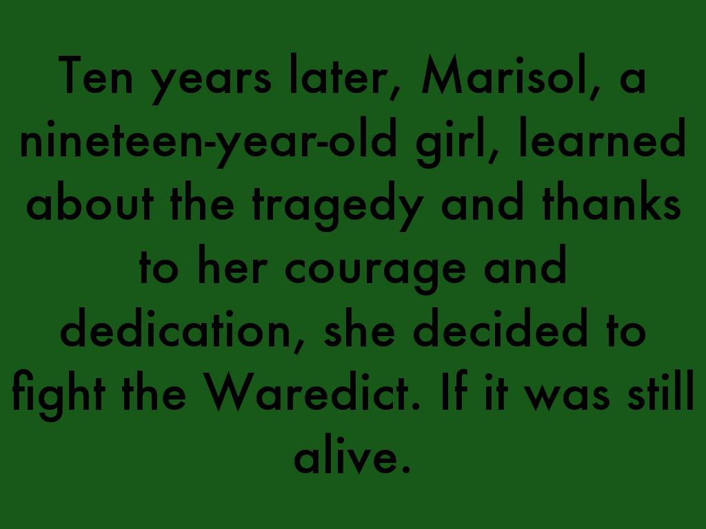 Ten years later, Marisol, a nineteen-year-old girl, learned about the tragedy and thanks to her courage and dedication, she decided to fight the Waredict. If it was still alive.