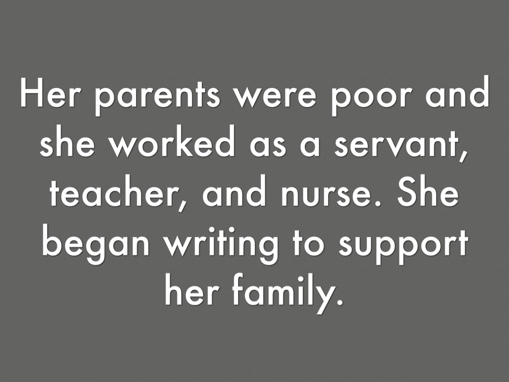 Her parents were poor and she worked as a servant, teacher, and nurse. She began writing to support her family.