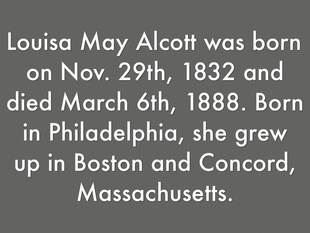 Louisa May Alcott was born on Nov. 29th, 1832 and died March 6th, 1888. Born in Philadelphia, she grew up in Boston and Concord, Massachusetts.