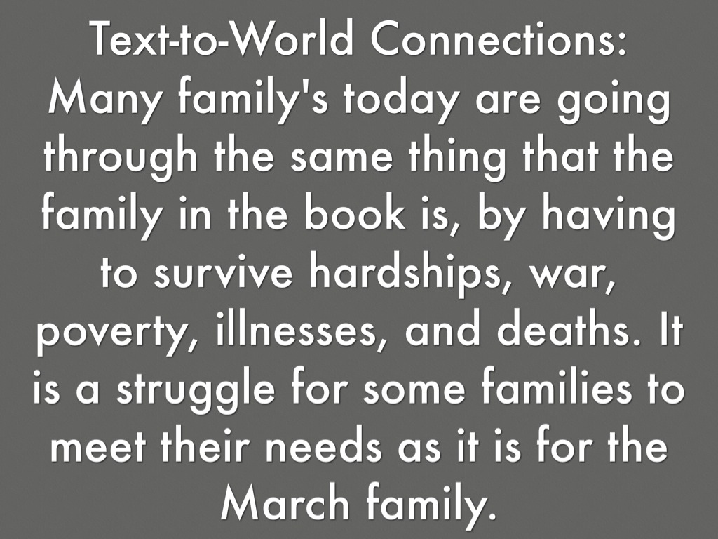 Many family's today are going through the same thing that the family in the book is, by having to survive hardships, war, poverty, illnesses, and deaths. It is a struggle for some families to meet their needs as it is for the March family.