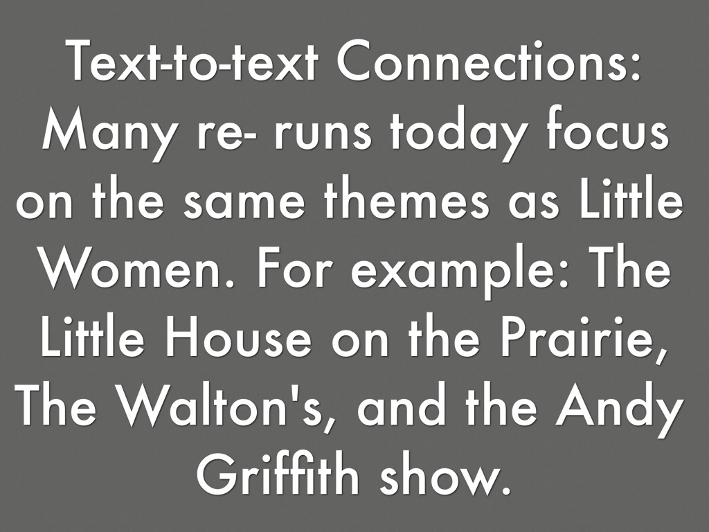 Many re- runs today focus on the same themes as Little Women. For example: The Little House on the Prairie, The Walton's, and the Andy Griffith show.