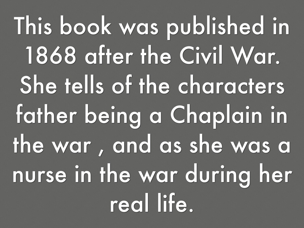 This book was published in 1868 after the Civil War. She tells of the characters father being a Chaplain in the war , and as she was a nurse in the war during her real life.