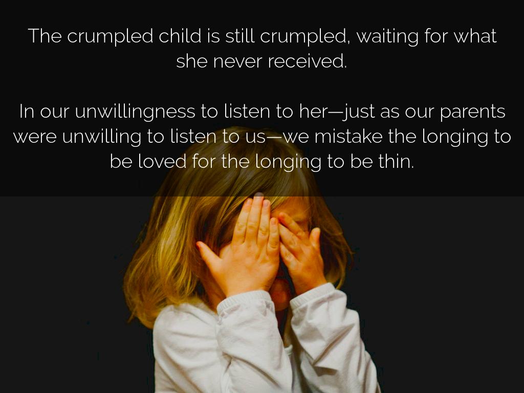 In our unwillingness to listen to her—just as our parents were unwilling to listen to us—we mistake the longing to be loved for the longing to be thin.