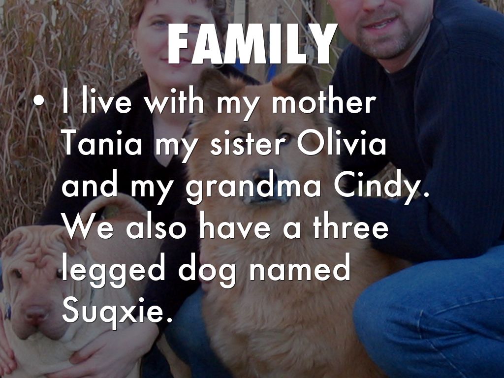 • I live with my mother Tania my sister Olivia and my grandma Cindy. We also have a three legged dog named Suqxie.