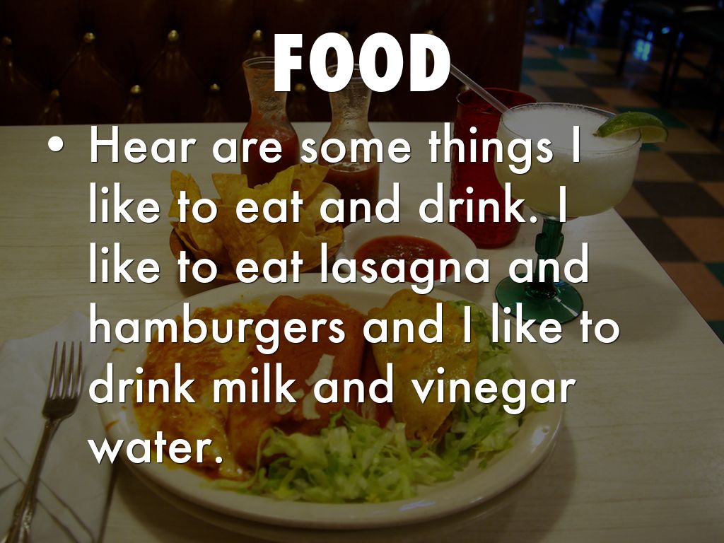 • Hear are some things I like to eat and drink. I like to eat lasagna and hamburgers and I like to drink milk and vinegar water.
