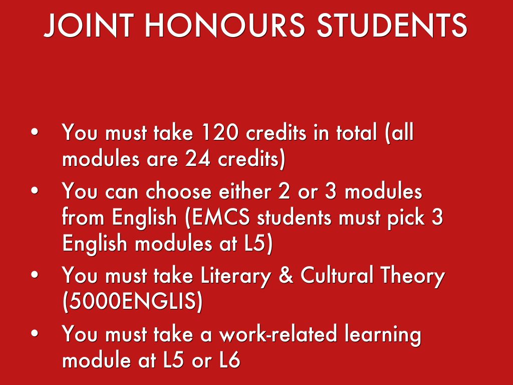 So: 3 English modules and 2 in your other subject, or vice versa. English & MCS students take TWO English modules at Level 6.