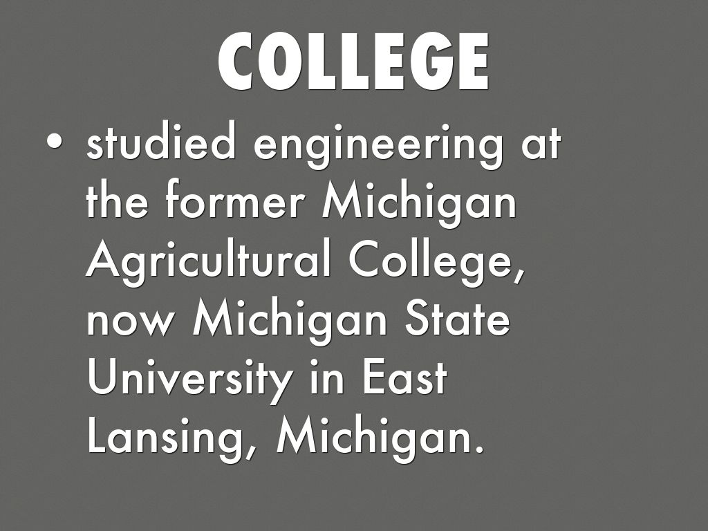 • studied engineering at the former Michigan Agricultural College, now Michigan State University in East Lansing, Michigan.