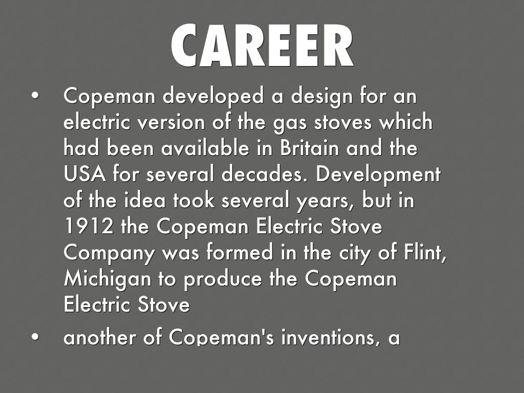 • Copeman developed a design for an electric version of the gas stoves which had been available in Britain and the USA for several decades. Development of the idea took several years, but in 1912 the Copeman Electric Stove Company was formed in the city of Flint, Michigan to produce the Copeman Electric Stove