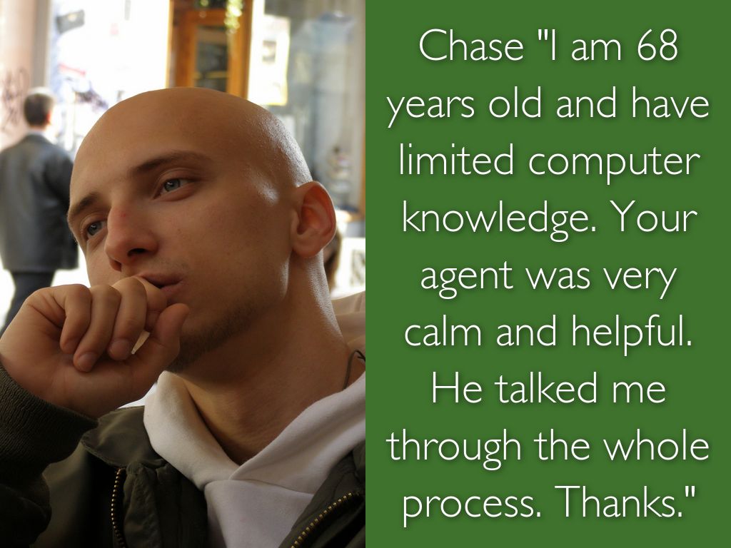 Chase "I am 68 years old and have limited computer knowledge. Your agent was very calm and helpful. He talked me through the whole process. Thanks."