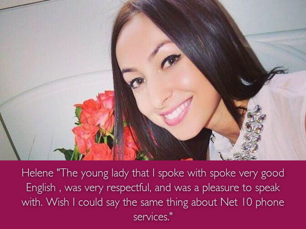 Helene "The young lady that I spoke with spoke very good English , was very respectful, and was a pleasure to speak with. Wish I could say the same thing about Net 10 phone services."
