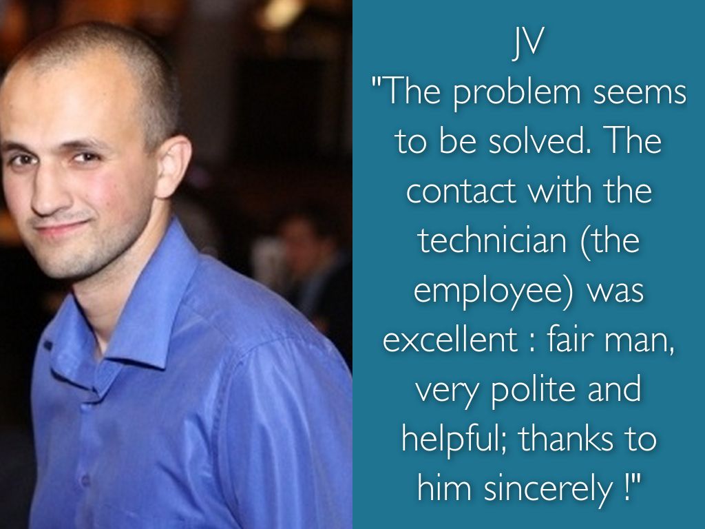 "The problem seems to be solved. The contact with the technician (the employee) was excellent : fair man, very polite and helpful; thanks to him sincerely !"