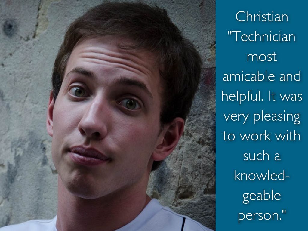 Christian "Technician most amicable and helpful. It was very pleasing to work with such a knowled-geable person."