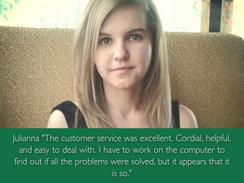 Julianna "The customer service was excellent. Cordial, helpful, and easy to deal with. I have to work on the computer to find out if all the problems were solved, but it appears that it is so."