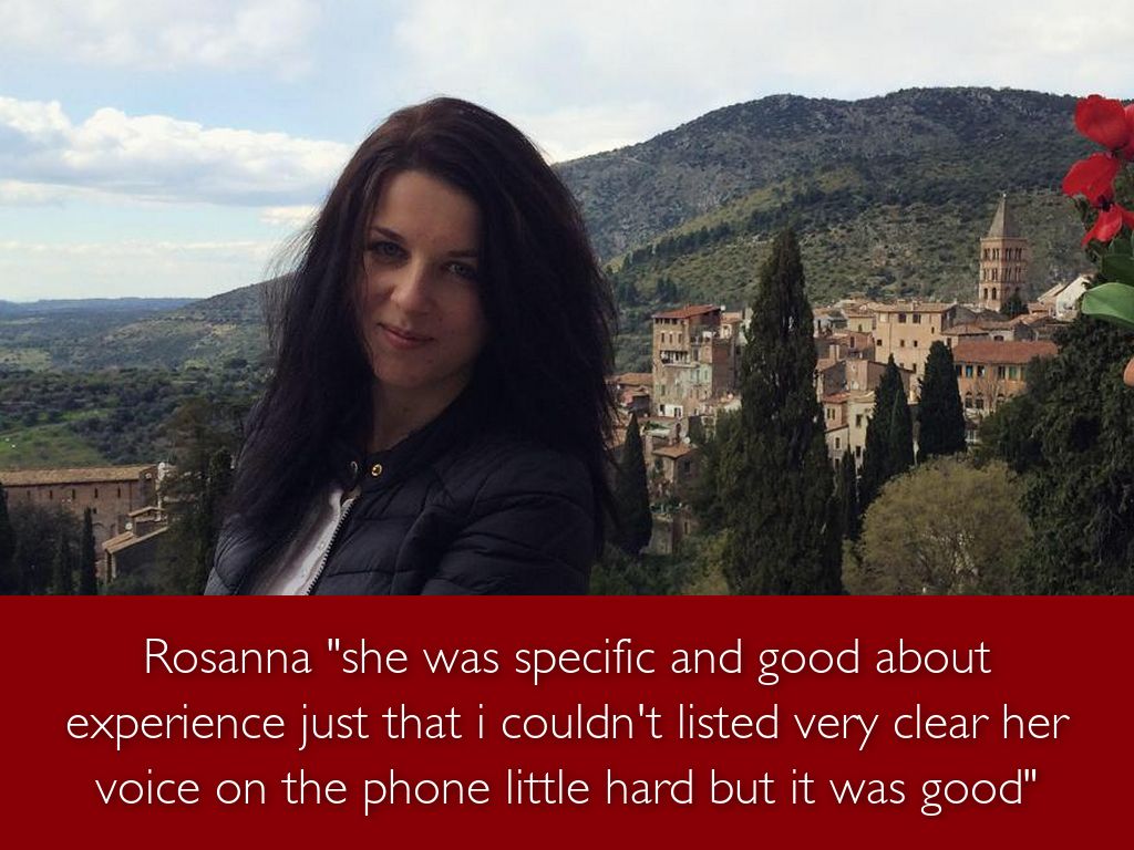 Rosanna "she was specific and good about experience just that i couldn't listed very clear her voice on the phone little hard but it was good"