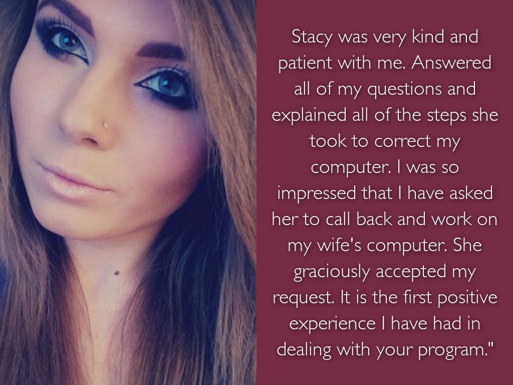 Stacy was very kind and patient with me. Answered all of my questions and explained all of the steps she took to correct my computer. I was so impressed that I have asked her to call back and work on my wife's computer. She graciously accepted my request. It is the first positive experience I have had in dealing with your program."