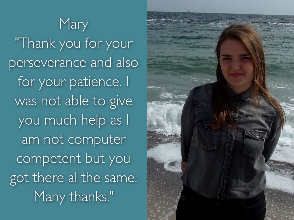 "Thank you for your perseverance and also for your patience. I was not able to give you much help as I am not computer competent but you got there al the same. Many thanks."
