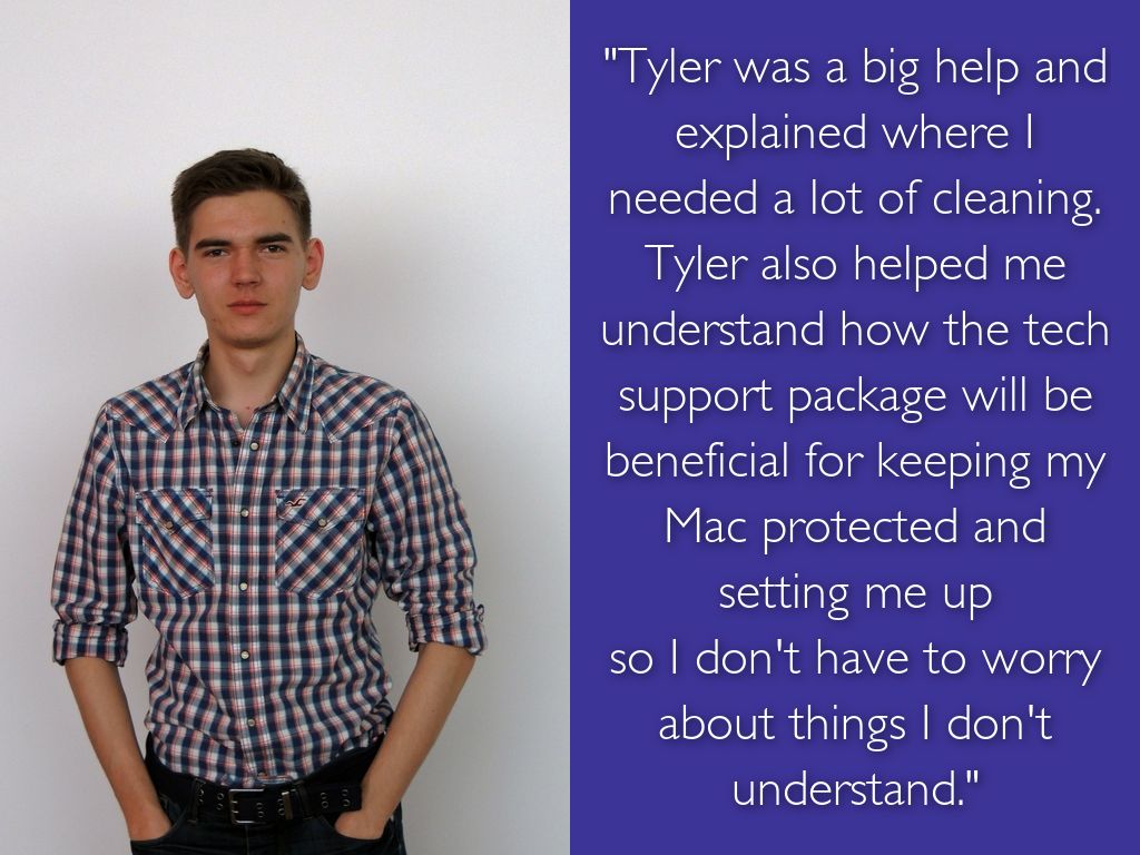 "Tyler was a big help and explained where I needed a lot of cleaning. Tyler also helped me understand how the tech support package will be beneficial for keeping my Mac protected and setting me up