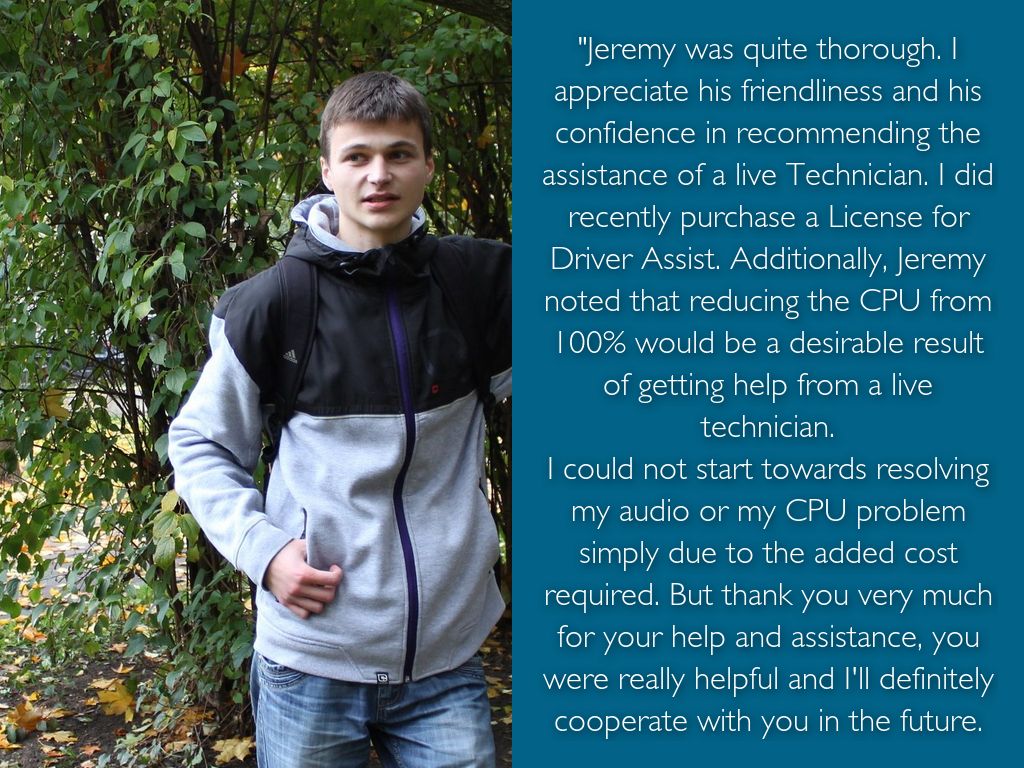 "Jeremy was quite thorough. I appreciate his friendliness and his confidence in recommending the assistance of a live Technician. I did recently purchase a License for Driver Assist. Additionally, Jeremy noted that reducing the CPU from 100% would be a desirable result of getting help from a live technician.