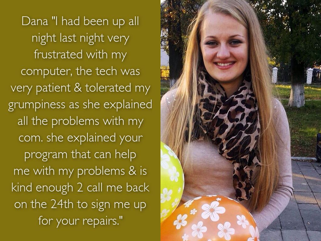 Dana "I had been up all night last night very frustrated with my computer, the tech was very patient & tolerated my grumpiness as she explained all the problems with my com. she explained your program that can help