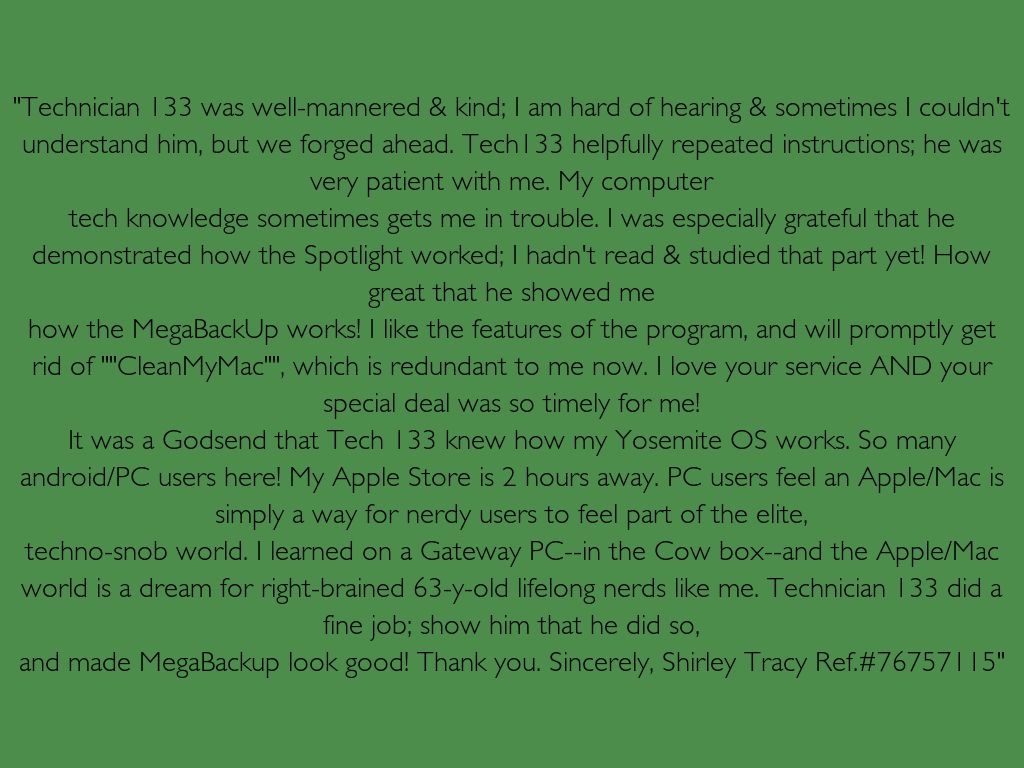 and made MegaBackup look good! Thank you. Sincerely, Shirley Tracy Ref.#76757115"