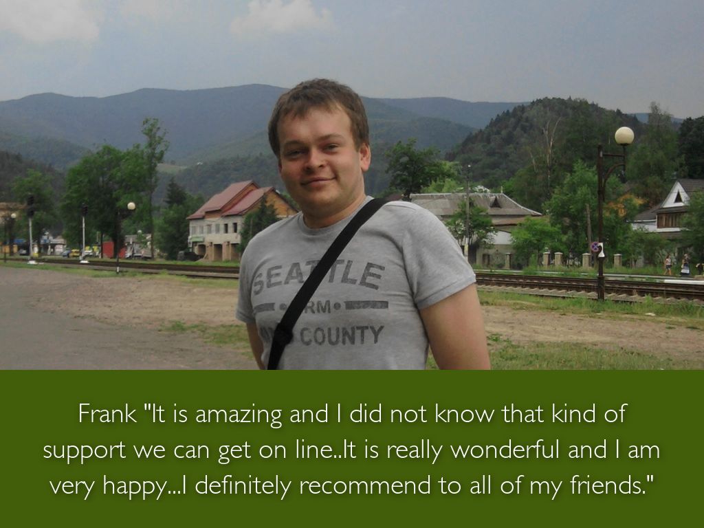 Frank "It is amazing and I did not know that kind of support we can get on line..It is really wonderful and I am very happy...I definitely recommend to all of my friends."