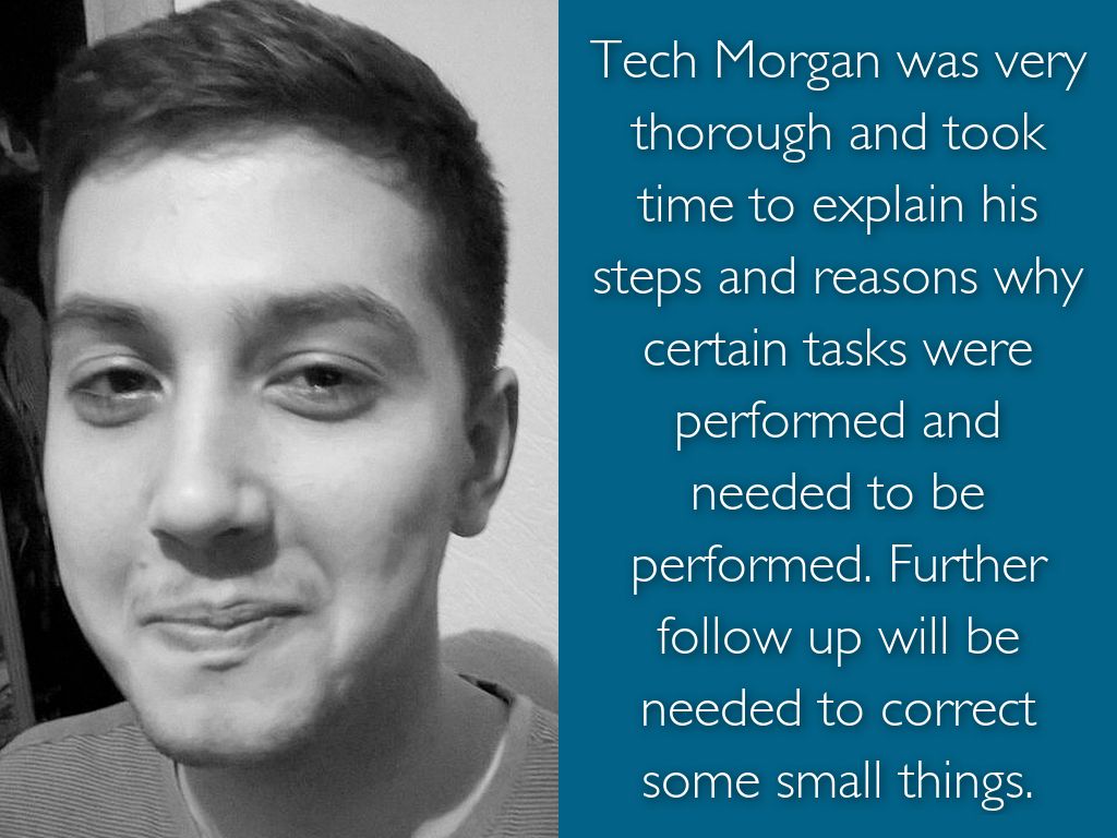 Tech Morgan was very thorough and took time to explain his steps and reasons why certain tasks were performed and needed to be performed. Further follow up will be needed to correct some small things.