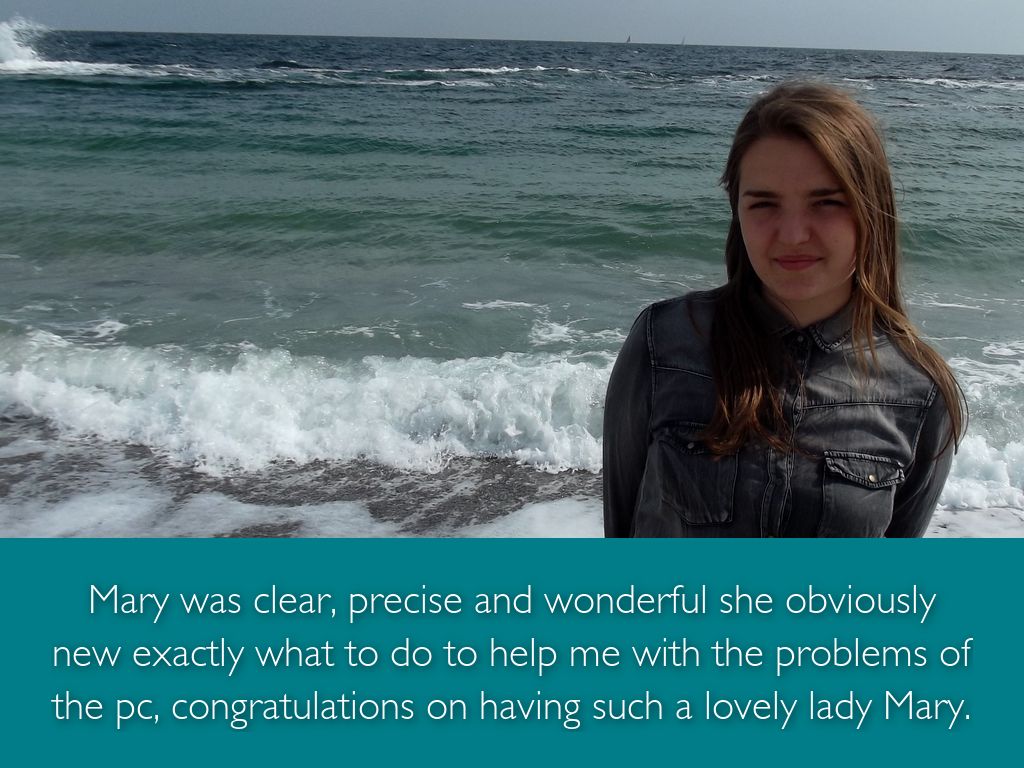 Mary was clear, precise and wonderful she obviously new exactly what to do to help me with the problems of the pc, congratulations on having such a lovely lady Mary.
