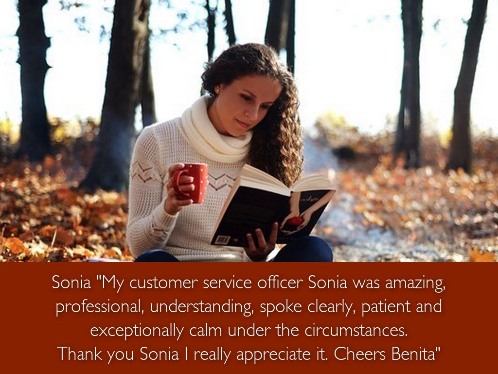 Sonia "My customer service officer Sonia was amazing, professional, understanding, spoke clearly, patient and exceptionally calm under the circumstances.